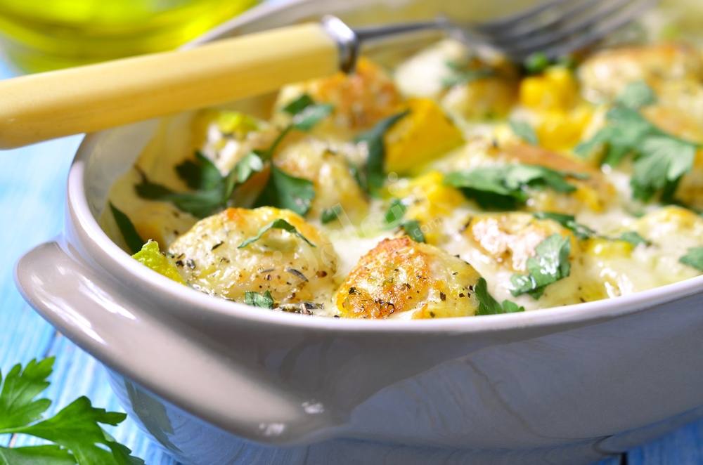 في صينية زجاج نضع طبقة من الخبز و نضع فوقها الدجاج تم طبقة أخرى من الخبز نسكب فوقها اللبن و نزينها بالبقدونس المفروم و الصنوبر .