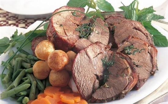 - يوضع اللحم في صينية، ويصب فوقه مزيج الزيت والعصير ثم يخبز من دون غطاء في فرن حرارته 350 درجة فهرنهايت أو 180 درجة مئوية لمدة ساعة وربع الساعة أو ساعة ونصف الساعة حتى ينضج اللحم.