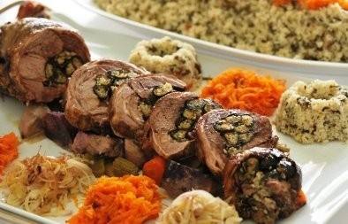- توضع الخضروات في صينية فرن ويُصب المرق، توضع الفخذ المحشوة فوق الخضروات.