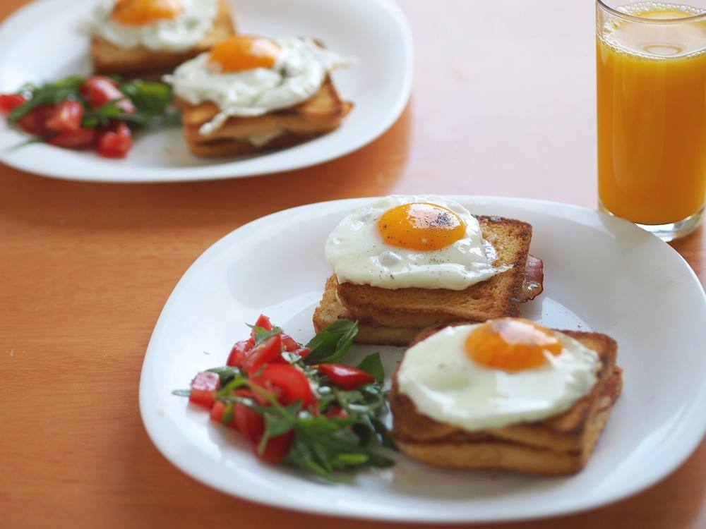 - توضع الطبقة الثانية من التوست، ويوضع عليها البيض المقلي.