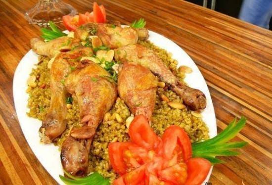- عند الاستواء تسكب الفريكة وتكلل بقطع الدجاج المسلوق والمحمر والصنوبر واللوز على الوجه وتقدم.
