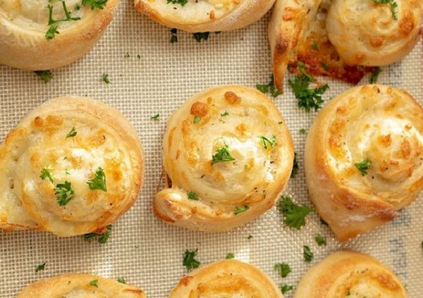 فطائر بالجبن والثوم عبارة عن فطائر محشوة بخليط من البقدونس والثوم وجبنة الموزاريلا وملفوفة كالرول ومقطعة توضع في الفرن حتى تنضج وتقدم .