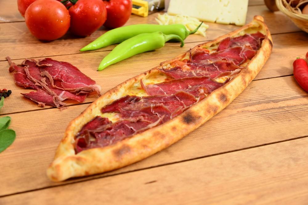 - يوضع مقدار معلقتين كبيرتين من الجبنة في العجين وتوزع فوقها قطع البسطرمة.