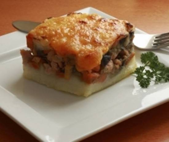 - ثم تحشى الفطيرة بحشوة البطاطس وتزين بجبنة الإمنتال أو الشيدروتدخل الفرن مرة أخرى لتخبز تقريباً 20 إلى 25 دقيقة على درجة 350 فهرنهايت .