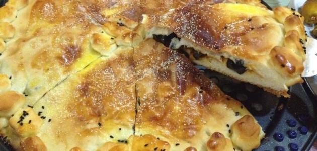 - ضعي وسط العجينة مقداراً مناسباً من الحشوة مع ملعقة كبيرة من الجبنة على الوجه، بعد ذلك أمسكي كلّ طرف من العجينة واطويه نحو الوسط حتّى تغلقي المربّع من جميع الأطراف، ثمّ ادهني العجينة بالقليل من الزّبدة وضعيها في الصّينيّة.