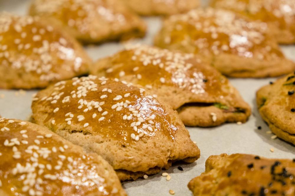 - تدهن الفطائر بالبيض، ويرش عليها السمسم.