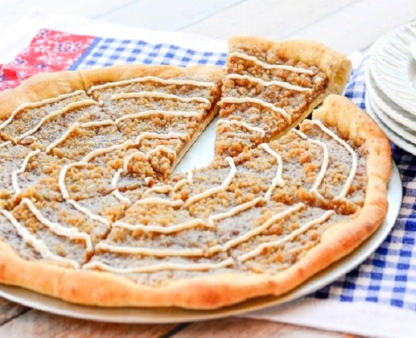 فطيرة القرفة والسكر سهلة التحضير للتحلية على الطريقة الألمانية مع طبقة الستروسل التي يتم تفتيت عجينتها على عجينة البيتزا بعد رشها بالقرفة، ويتم تقديمها مع رذاذ من السكر المكثف المثلج الذي يتم تحضير بالسكر البودرة والحليب ونكهة الفانيليا، حتى يمتص السكر السائل ويتكاثف و يتجمد بشكل قاسي .
