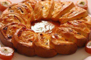 - تُدهن صينية فرن مستديرة بقليل من الزبدة وتُرص حلقات العجين بحيث يوضع طرف كل حلقة الحلقة التي قبلها لتكون على شكل سلسلة.