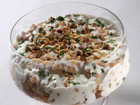 4.  يوزع خليط اللبن ثم الحمص المهروس.