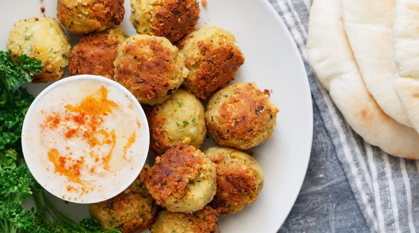 - تقدم الفلافل مع صلصة الطحينة واللبن والخضروات المشكلة
