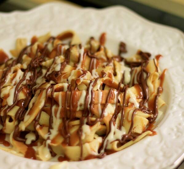- بعدها نقطع كلاً منها قطع طولية حتى يصبح شكلها كالفوتشيني ونضعها مع بعضها في طبق ثم نضع فوقها شوكولاته النوتيلا .