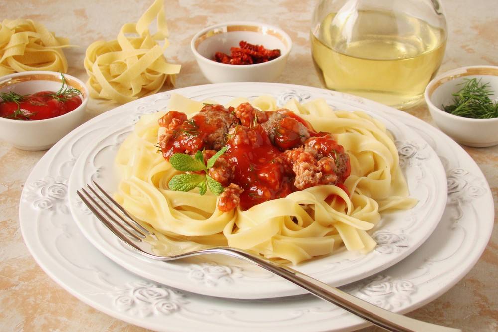 - توضع الفوتوتشيني في الطبق، ويوضع فوقها كرات اللحم مع صوص البولونيز.