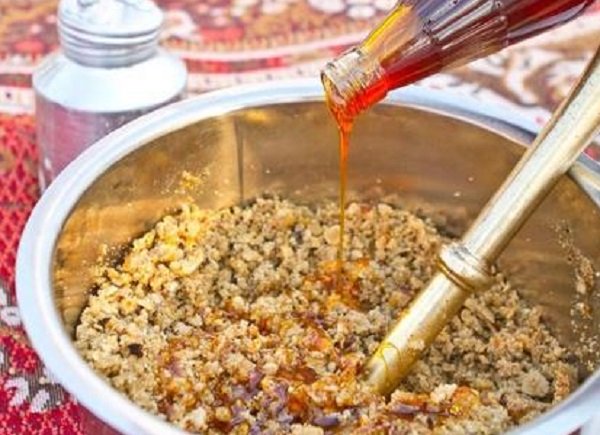 - ثم نفتت قطع العجين المقلية و نضيف السمن و التمر و نفركهم باليد جيداً حتى تتفتت و تختلط المكونات