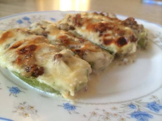 - نجهز البشاميل ونضع القليل من البشاميل في قاع وعاء بايريكس ثم نصف قوارب الكوسة في الوعاء ثم يملىء بحشوة اللحمة المفرومة .