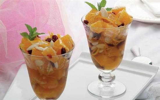 2. تخلط مكعبات البرتقال مع قطر السكر وعصير البرتقال واللوز والصنوبر.
