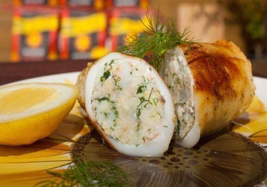 9. قطعى الكاليمارى المحشى وقدميه مع حشوة الأرز بعد تمام نضجها زينى الطبق بشرائح الليمون .