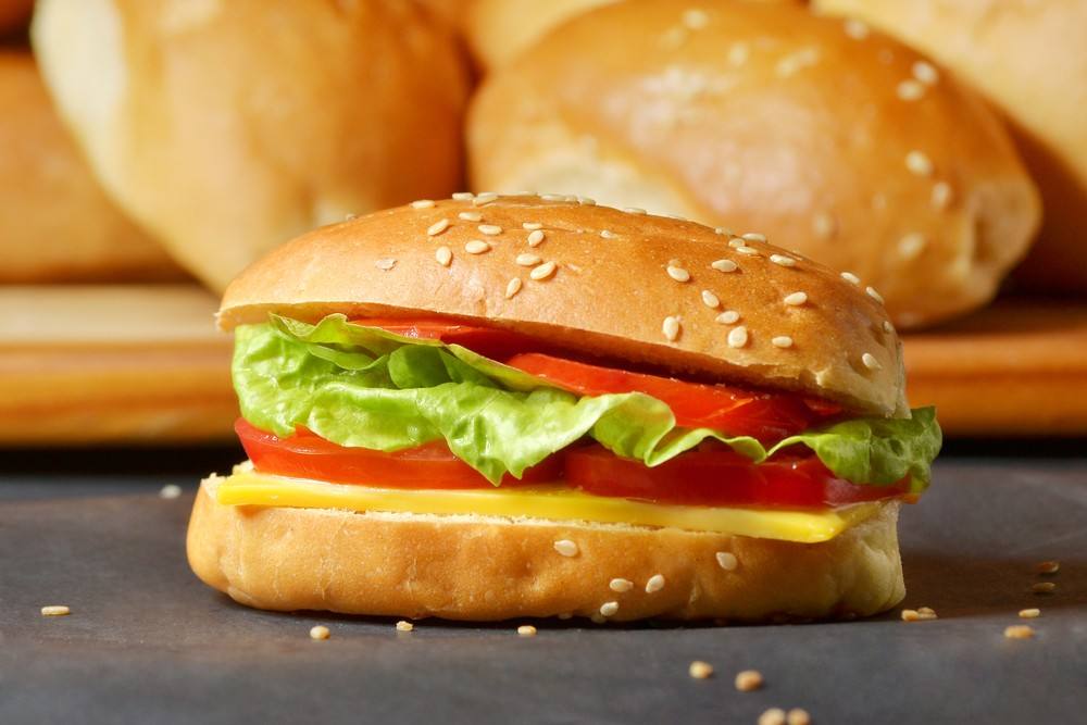2. توضع شريحة الجبنة، ويوضع فوقها شرائح الطماطم والخس.
