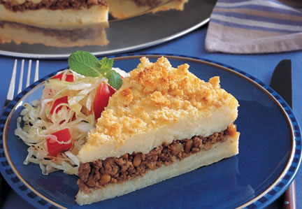 - تُوزّع نصف كمية البطاطا المهروسة في صينية الفرن المجهزّة سابقا ثم تُوزّع الحشوة فوق البطاطا وتليها الكميّة المتبقية من البطاطا المهروسة على الوجه.