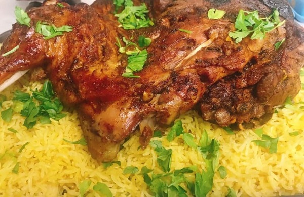 كتف خروف مشوي مع رز وصفة لذيذة ومناسبة للعزائم والمناسبات فهي عبارة عن كتف خروف مشوي بالفرن ومقدم فوق أرز بسمتي بمذاق رائع وشكل شهي .