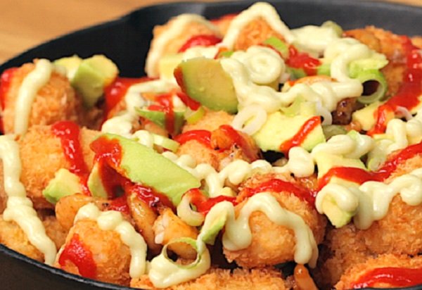 - نضع كرات السوشي المقرمشة في طبق التقديم ثم نضيف الجمبري المشوي ثم نقطّع حبة أفوكادو فوقها ونضع مايونيز و صلصة حارّة .