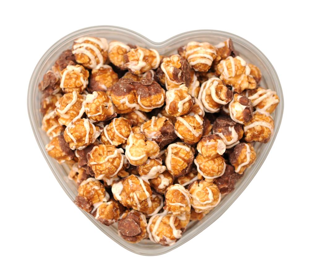 - بإستخدام 2 ملعقة معدنية ويوضع أجزاء من الفشار في طبق على شكل قلب .
