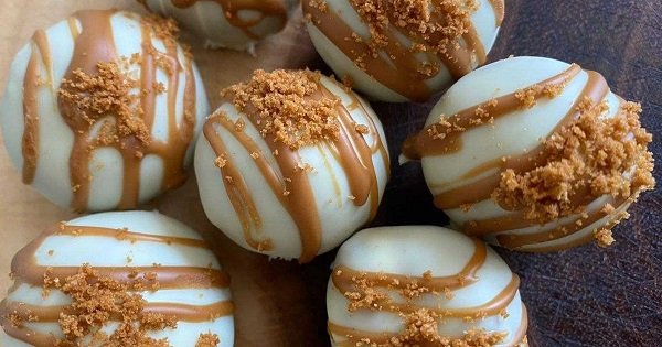 6. نذوب القليل من زبدة اللوتس على نار هادئة ونزين بها الكرات مع رشة بسكويت مطحون وبذلك يكون حلى كرات اللوتس جاهزاً للتقديم .