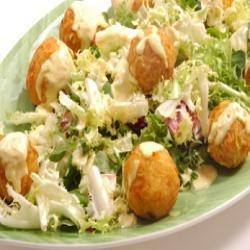 8. تُرفع من الزيت وتوضع على منشفة ورقية حتى تمتص الزيت الزائد و تُقدم مع السلطة الخضراء .