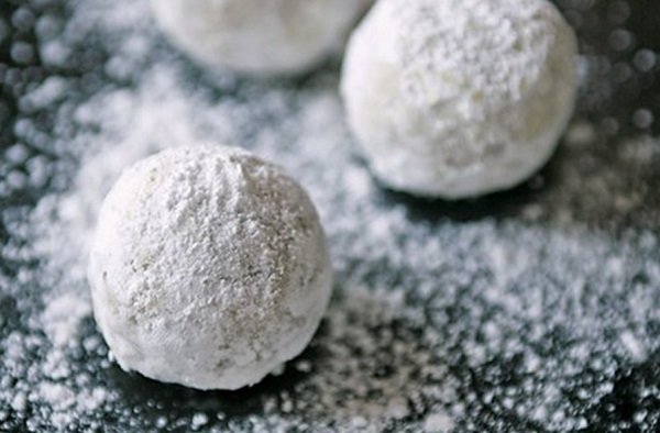 - في وعاء متوسط، اخفقي الزبدة مع الفانيليا حتى تصبح ناعمة. امزجي 6 ملاعق سكر الزينة مع الدقيق وضعيهم فوق مزيج الزبدة حتى تمتزج جميعا. ضعي معهم الجوز، وشكلي من هذا الخليط كرات وضعيها متباعدة في صينية غير مدهونة