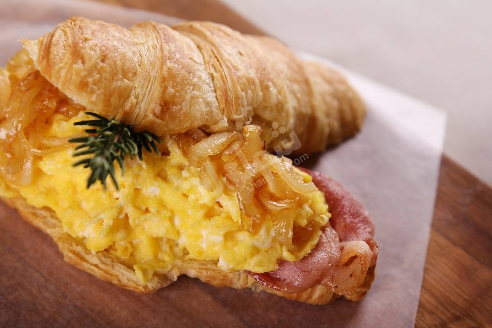 - يفتح الكرواسان نصفين و يحشي بالبيض المخفوق و يقدم مع الطماطم و اللحم .
