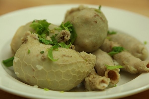 ٧-في قدر توضع الكروش ويسكب فوقها الماء وتتبل بالملح والفلفل والخل.