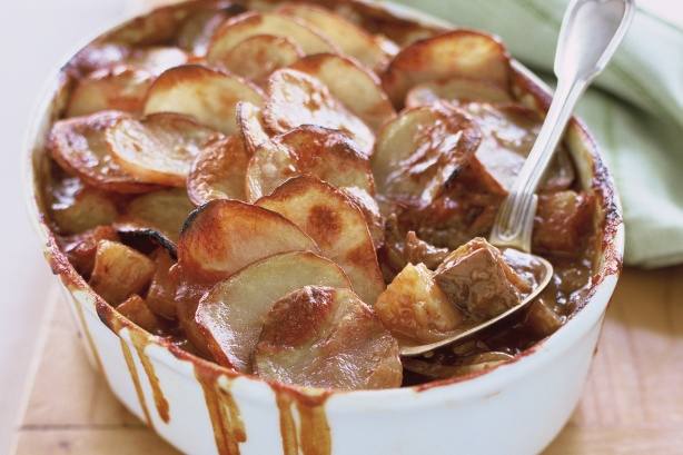 4. وتوضع طبقة بطاطس على الطبق ثم يغطي ويُخبز لمدة 50 دقيقة ثم نزيل الغطاء ويطهى لمدة 25 دقيقة أخرى حتى تحمر البطاطس .