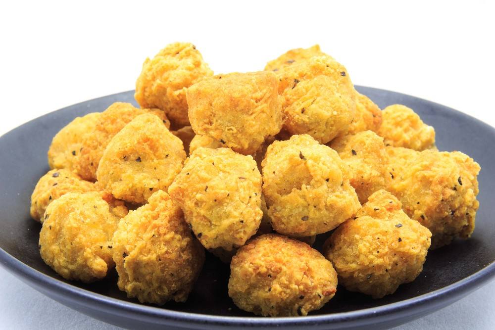 - نحضر صينية ونرص بها كرات كفتة الدجاج ، وندخلها الثلاجة لمدة ربع ساعة حتى تتماسك التغطية عليها