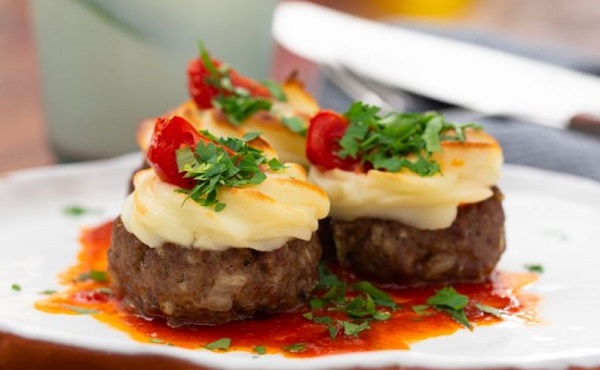 كفتة حسن باشا التركية طبق رائع وشهي عبارة عن لحم بشكل أكواب محشوة بجبنة الموزاريلا وعلى وجهها البطاطا المهروسة مع صوص أحمر ومشوية بالفرن .