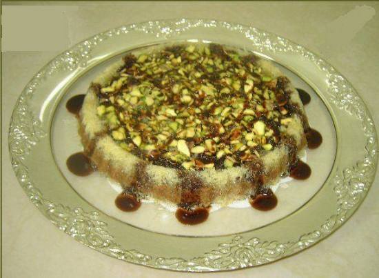 - بعد نضجها ُتشرّب بالشراب السكري ثم تقلب في طبق التقديم وتزين بالفستق أوالشوكولاته السائله .