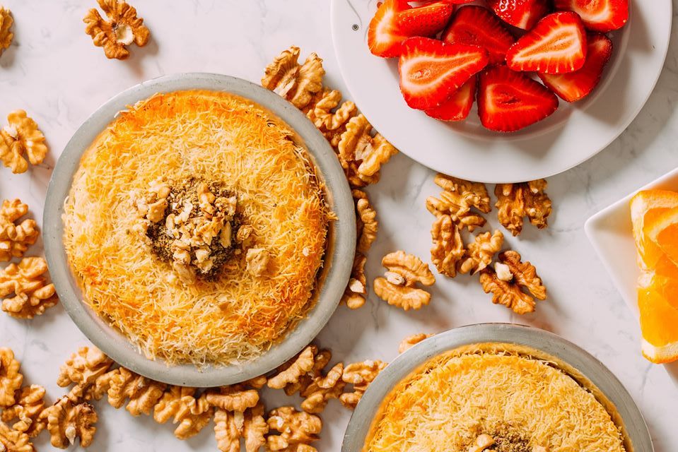 - · يوزع خليط بودينغ الورد على الكنافة. ثم نضع الفراولة والرمان والورد الورد على الكنافة قبل التقديم. وبالعافية!