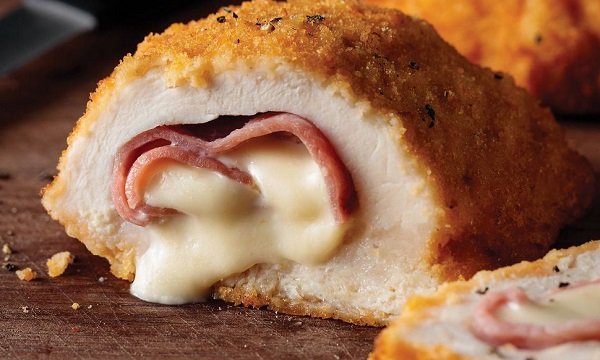 - نضع قطعة كوردون بلو و نتخلص من أعواد التثبيت ثم نسكب فوقها صلصة البشاميل و تصبح جاهزة للتقديم .