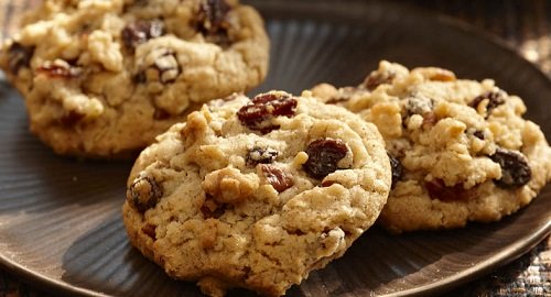 كوكيز الشوفان والجوز قطع بسكويت شهية ومفيدة من دقيق الشوفان، البيض، الزبيب، الزبدة، السكر، الطحين، القرفة والجوز ، يمكن ان تكون هذه القطع بنكهة القهوة لو رغبت ربة المنزل .