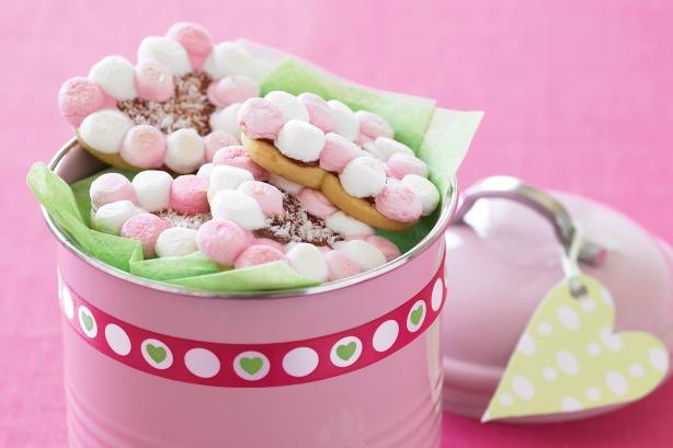 6. تفرد المربى على البسكويت ويرتب المارشميللو على الحواف .