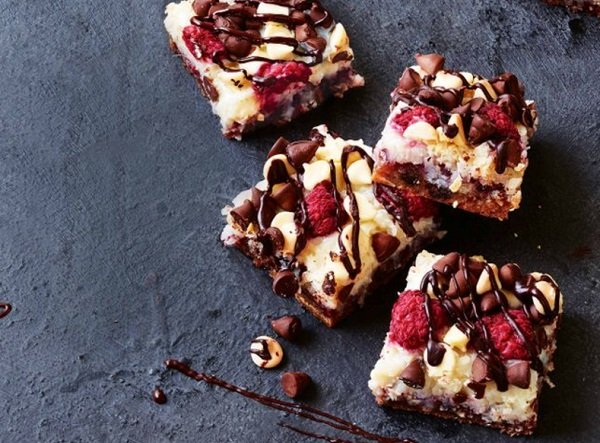 - مددي المربى على وجه عجين الكوكيز، ورشي جوز الهند. ثم غطي جوز الهند بالكامل بالحليب المكثف. ثم ضعي التوت وقطع الشوكولاتة. واخبزيهم لمدة 30 دقيقة أو حتى يصبح اللون ذهبياً حول الحواف وتستقر. ثم رشيهم بالمزيد من الشوكولاتة عند الرغبة.