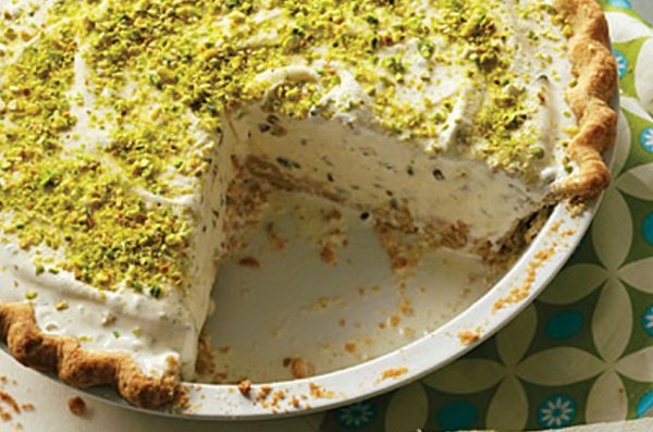 - قشري الجلد البني الورقي عن الفستق بسكين مسننة، ثم اطحنيهم بخلاط الطعام حتى يصبحوا ناعمين تماماً، رشيهم فوق الفطيرة، وقدميها مباشرة.