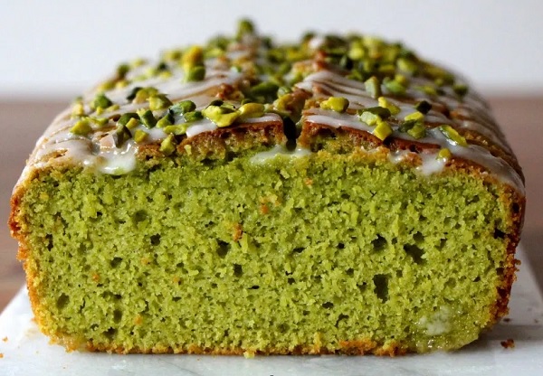 - نخرج الكيك من الفرن ونتركه يبرد ثم نقطعه ونزينه بالبستاشيو و الكريمة وبذلك يكون جاهزاً للتقديم .