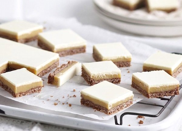 كيكة الشوفان وجوز الهند المغطى بطبقة من الكراميل المحلى بالعسل والمخلوط بالحليب المكثف، ليقدم الكيك على شكل مربعات بعد تبريده وسكب الشكولاته البيضاء عليه .