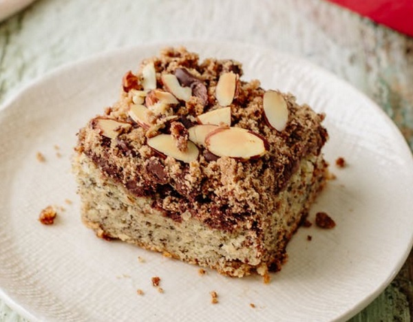 8. قسمي الستريوسل بالتساوي فوق العجين، رشي اللوز على الوجه، واخبزيه لمدة 40 – 45 دقيقة أو حتى تخرج الشوكة نظيفة بعد غرزها في المنتصف، برديه في الصينية وقدميه ساخناً أو بدرجة حرارة الغرفة.