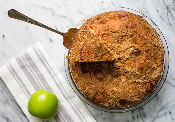 - اسكبي نصف الخليط في قعر صينية الخبز. وضعي شرائح التفاح حتى تغطيها. رشي القرفة والسكر. ضعي بقية الخليط فوق التفاح.