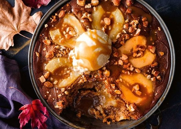 - اخلطي الطحين، الزنجبيل، القرفة ، الشوكولاتة السائلة والبيضة في المزيج المبرد، حركي معهم الإجاص المبرد، اسكبيهم في الطبق المجهز، رتبي أنصاف الإجاص، الجانب المقطوع لأعلى على وجه المزيج ( لا تدفعيه في المزيج)، اخبزيه لمدة 20 دقيقة، رشي الكاجو، واخبزيه لـ 30 – 35 دقيقة أخرى أو يقسو الوجه عند لمسه ( غطي الوجه بورق القصدير بشكل فضفاض في حال احمرّ بسرعة)، اتركيه لمدة 10 دقائق.