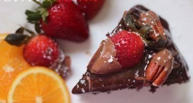 - زيني الكيكة من الأعلى بالفراولة الطازجة المغمسة بالشيكولاتة والمكسرات ومبشور الشوكولاتة البيضاء.