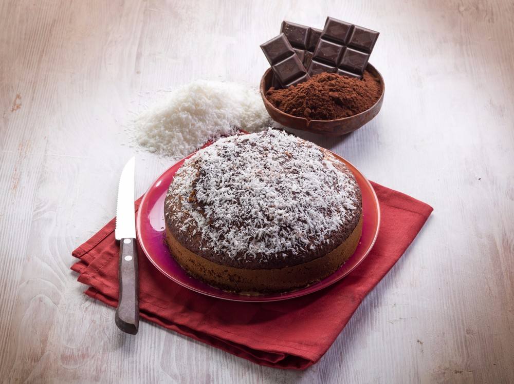 - يضاف خليط الدقيق بالتدريج مع الخفق المستمر، ثم يضاف جوز الهند.