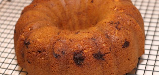 - نصبّ الخليط بقالب الكيك المدهون بالزيت والدقيق.