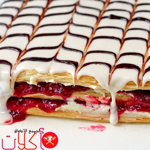 وهو من اشهى انواع الحلويات المقرمشة والغنية فهو عبارة عن طبقات من عجينة البف باستري وبينها طبقة من شوكولا بيضاء ممزوجة بمربى الفراولة الشهي وتعلوه طبقة من الصوص الابيض المزين بالشوكولا واليكم طريقة التحضير