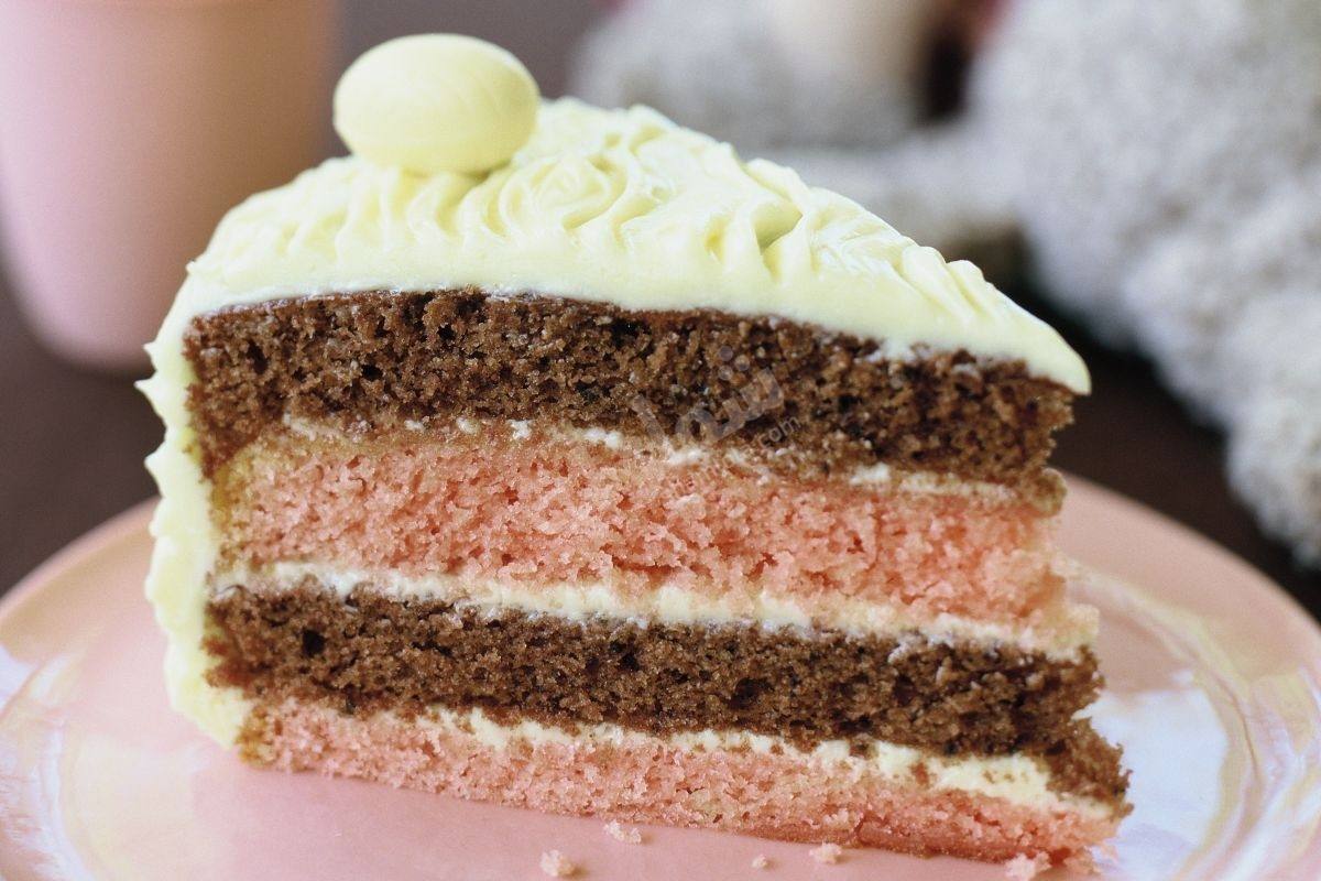 - تخفق الزبدة مع السكر بخلاط كهربائي حتى تصبح خفيفة وهشة ثم يضاف البيض واحدة تلو الأخرى مع الخفق بعد كل إضافة حتى تمتزج تماماً ثم يقلب بخفة مع الدقيق و يقسم الخليط بالتساوي بين 2 طبق ويضاف تلوين الطعام الوردي لطبق والقرفة والكاكاو للبق الأخر و يقلب كل طبق ليتجانس و يصب الخليط الوردي في صينية و مزيج الشوكولاتة في الأخرى .